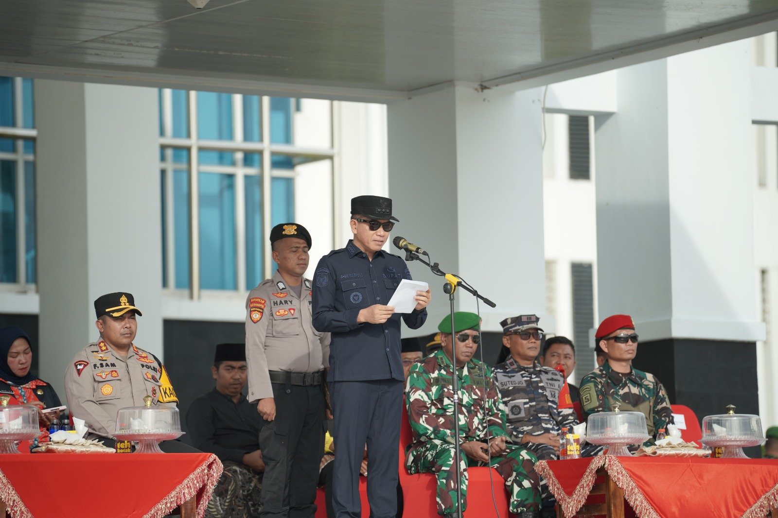 Sebelum membacakan amanat Kapolri, Bupati Irham Kalenggo mengajak seluruh peserta apel untuk sejenak menundukkan kepala.